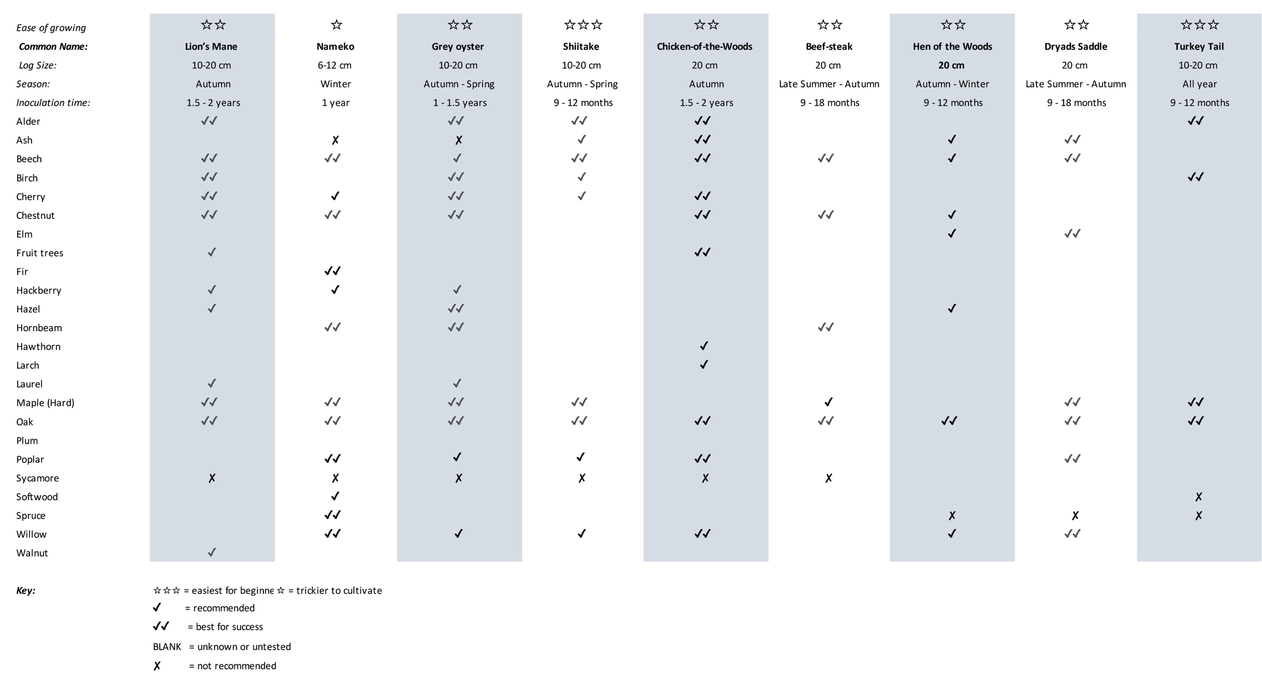 We have dawn up a table below and added to below to help you source the best log for your mushrooms.