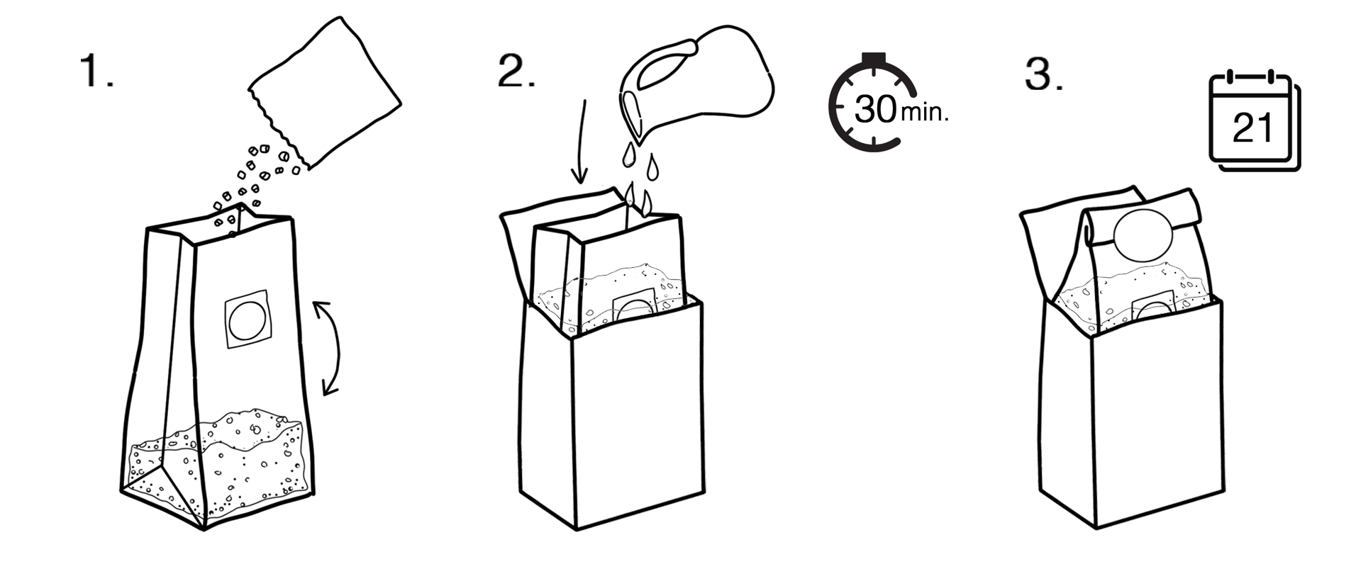 Once your mycelium is fully developed, it’s as simple as OPEN – WATER – GROW!