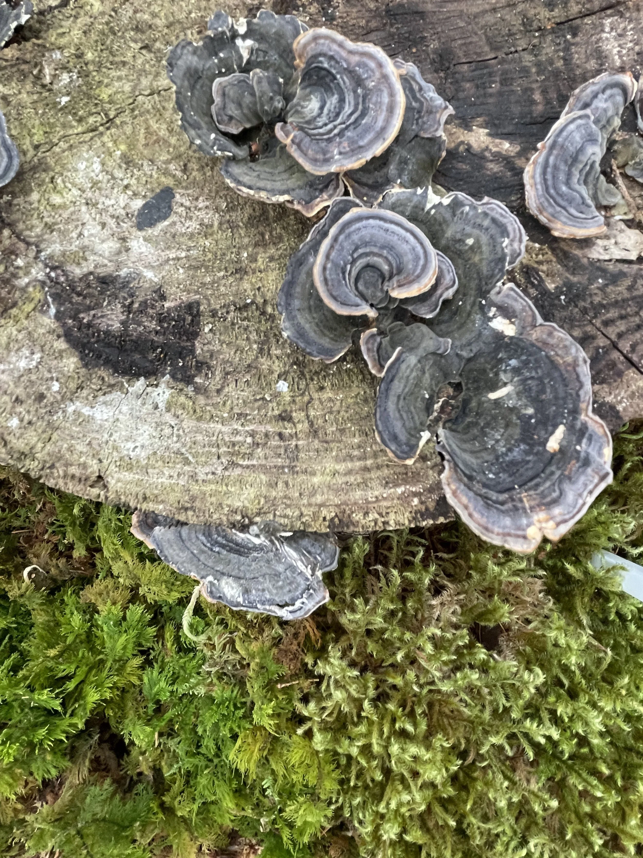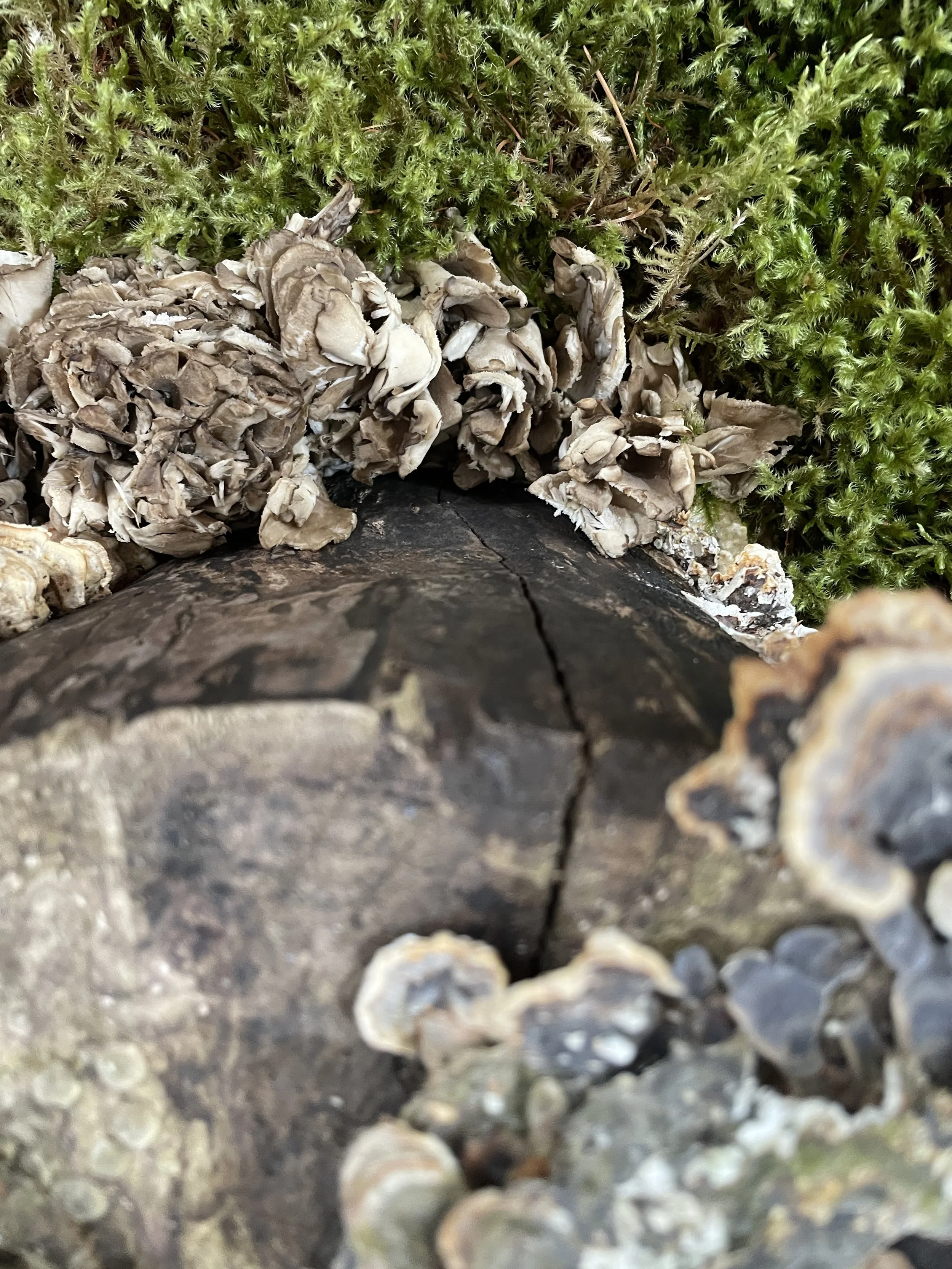 Fruiting mushroom logs nestle amongst our woodland floor and beneath our mush columns.
